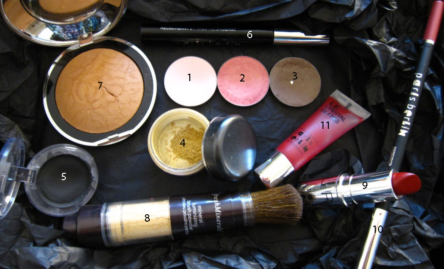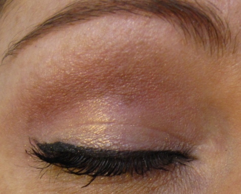 Die Augen grundiere ich zuerst mit einem hellen matten Rosa (Nr. 45), die Schlupflider werden mit Braun-grau (Nr. 26) und danach mit einem gold-glänzenden Rosa (Nr. 72) betont. Die Lidschatten sind von der Deckkraft her mittel, nicht zu schwach aber auch nicht stark pigmentiert. Auf das bewegliche Augenlid gebe ich noch goldfarbigen Glanzpuder (Le Poudre Lumière, Nr. LU 4). Am Schluss ziehe ich einen schwarzen Lidstrich mit L'Intense Liner Nr. IL 1 (hält super gut) und tusche die oberen Wimpern mit schwarzer Mascara (Xtra Easy, XE 1), die die Wimpern verlängert aber nicht verdichtet (alles von ParisBerlin).